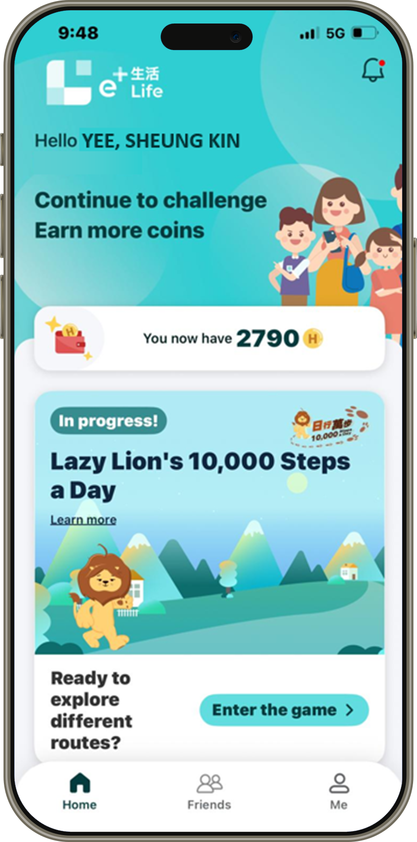 With the slogan "Step up to 10,000! Spark joy in every movement!", the Walking Challenge is conducted through the "e+Life" App under the eHealth App. It gamifies physical activity and makes it an enjoyable habit. The public can complete various missions on the "e+Life" App, synchronise step records, earn Health Coins, and redeem gifts.